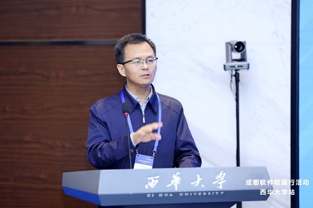成都市经济和信息化局副局长蒲斌在致辞中表示,“加快建设高质量人才队伍是推动软件产业高质量发展,特别是推动基础软件、工业软件等领域关键技术加快实现突破的关键,产学研合作是培养高素质人才的重要平台,开展成都软件校园行活动,目的就是要搭建一个良好的交流平台,有效促进高校、企业、人才、项目面对面交流,助推软件技术的协同创新和产业化转化。希望在座各位能够借助这个平台,加强合作探讨,以实际行动推动人才培养高质量发展,推动软件关键技术加快突破。”