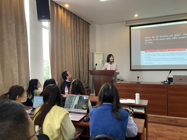11月7日下午,西南财经大学公共管理学院李丁教授应邀在一教4036做了主题为“Water afar off quenches not thirst? The health benefits of the south-north water transfer project in China”的学术报告。经济学院相关专业教师和研究生参加了学术报告会。报告会由经济学院商务管理系副主任何春燕主持。