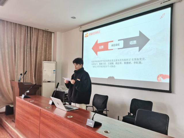会议第一项,由本支部雍林子青、王显刚、胡志琴、黎雅婷、李虹燕等预备党员依次上台发言,几位同志总结了成为预备党员后的各项表现,汇报了自己的所思所得,表达了转为正式党员后将继续坚持为人民服务的宗旨,努力提高自身能力的决心。接着,由11位党员进行投票表决是否同意接受该5位同志转正为正式党员,支部副书记张若芸和宣传委员李涛负责唱、计票,结果全票通过。