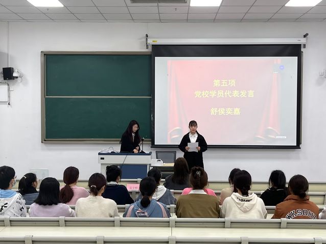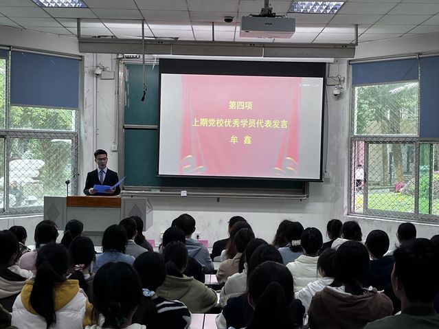 大会伊始,会议在视频《不负韶华·赓续前行》中会议拉开序幕,向全体参会人员展现党校学员积极向上的精神状态。视频之后,主持人宣读了2023年春季入党积极分子经济学院班干部名单,在场领导及老师们为他们颁发聘书。紧接着,在领誓人的带领下,党校干部和党校学员分别起立宣誓,铿锵有力的誓言表明了他们努力拼搏、奋勇向前的决心。随后,上期优秀党校学员代表牟鑫及本期郫都校区及宜宾校区学员代表舒侯奕嘉、任金梅上台发言,他们表示:要好好珍惜在党校学习的美好时光,认真学习党史。接着,本期培训班班长吉吾日伍、副班长闫轶雯上台发言,他们表示:每个人的辛苦和努力都终有回报,祝愿学员们在党校学习中都能学有所思、学有所获。
