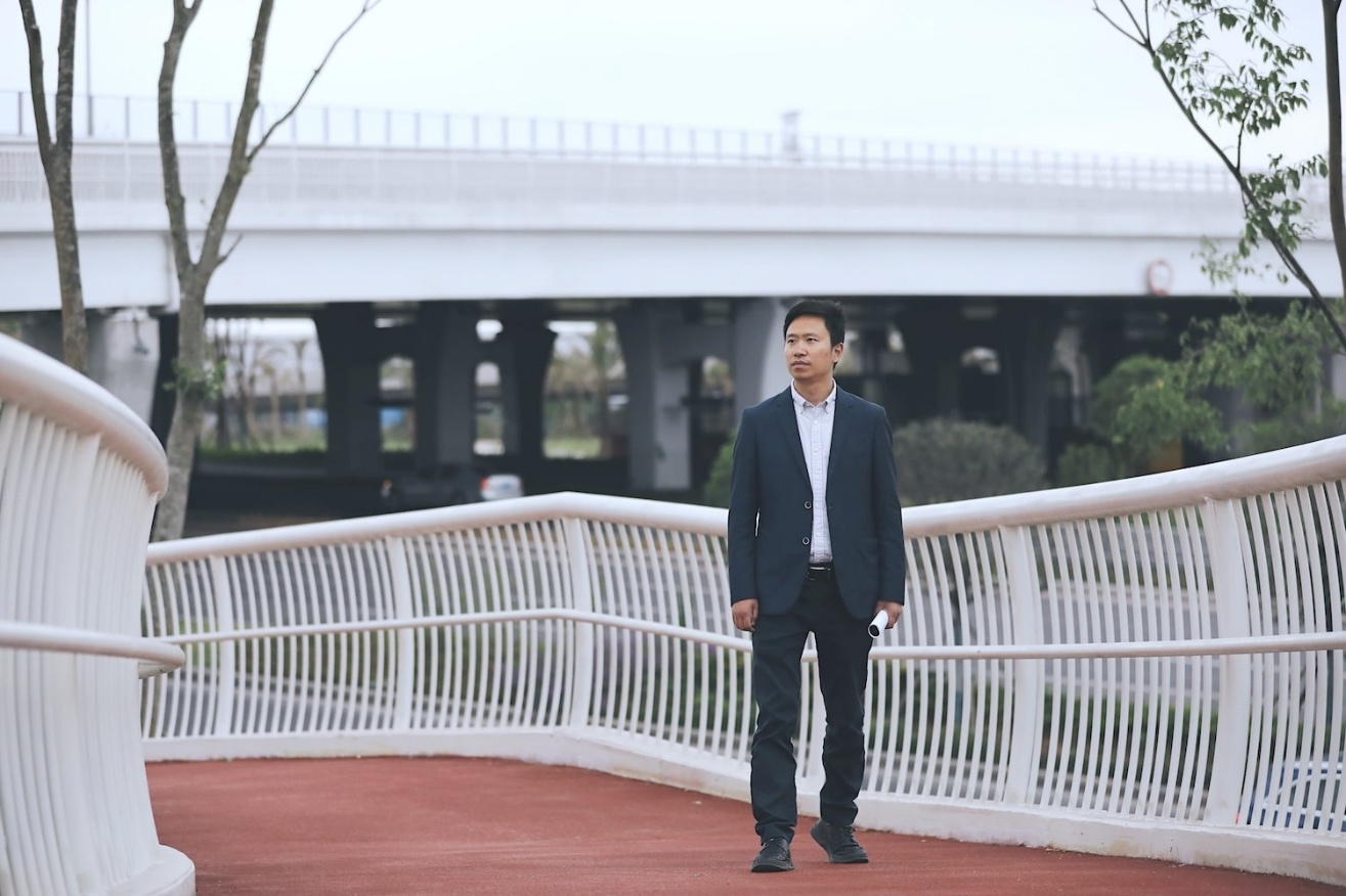 文继涛站在自己设计的桥梁上。