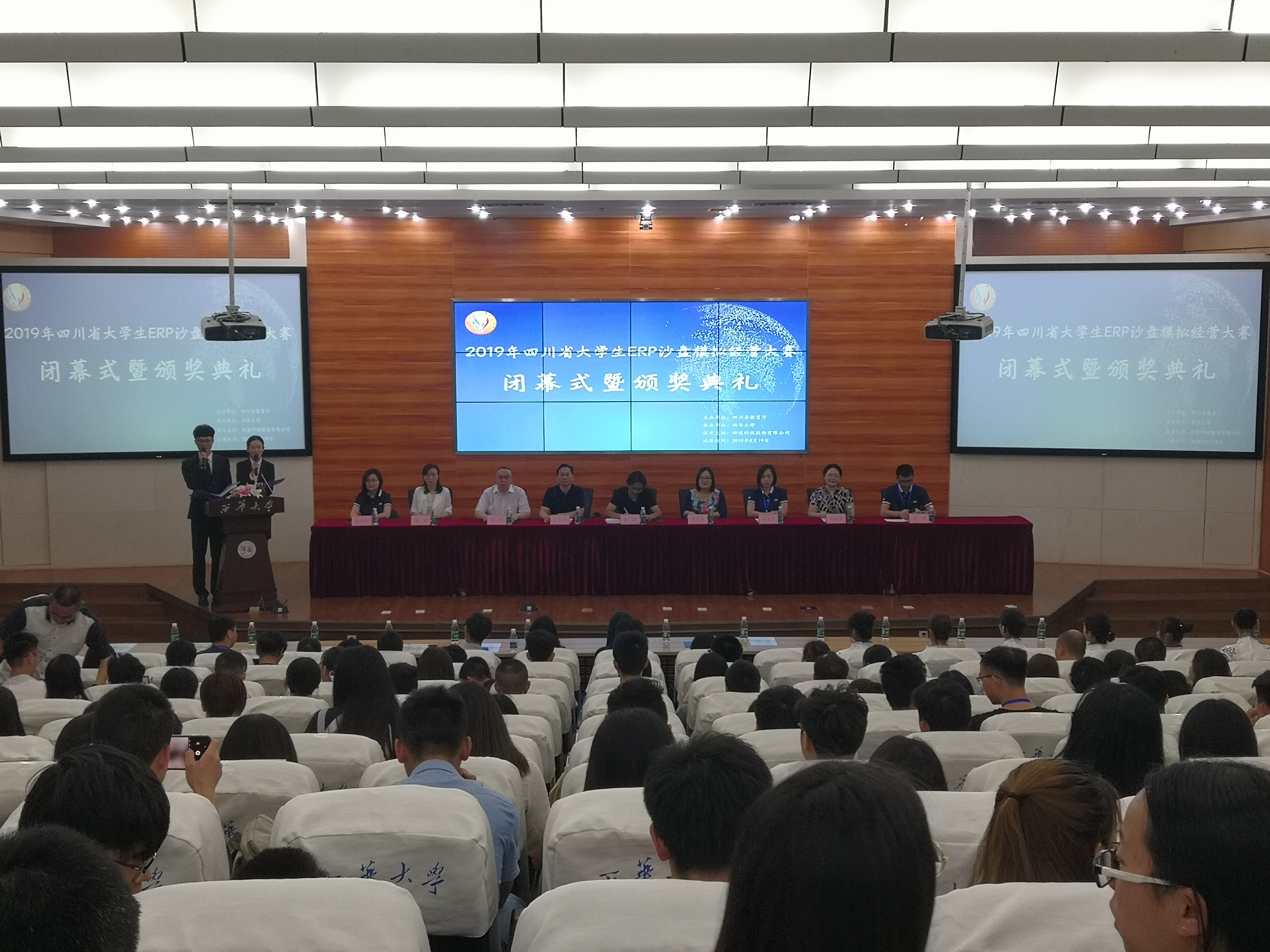 5月19日上午,大赛闭幕式暨颁奖典礼在图书馆报告厅举行。西华大学副校长费凌、教务处处长蒋珍菊、党委学生工作部部长王大清、管理学院党委书记龙雅芳、副院长周佩、党委副书记谢君,新道科技股份有限公司四川省区直销总经理侯爱华、分销总经理瞿刚、直销副总经理成华敏和来自省内各高校的参赛学生、指导老师以及大赛志愿者共200余人参会。