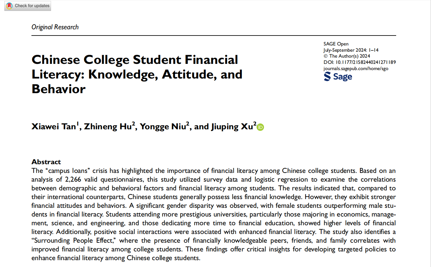 近日,管理学院教师谈夏维在SSCIJCR一区期刊《Sage Open》发表题为“Chinese College Student Financial Literacy: Knowledge, Attitude, and Behavior”的研究论文。谈夏维博士为该论文的第一作者,西华大学为第一通讯单位。