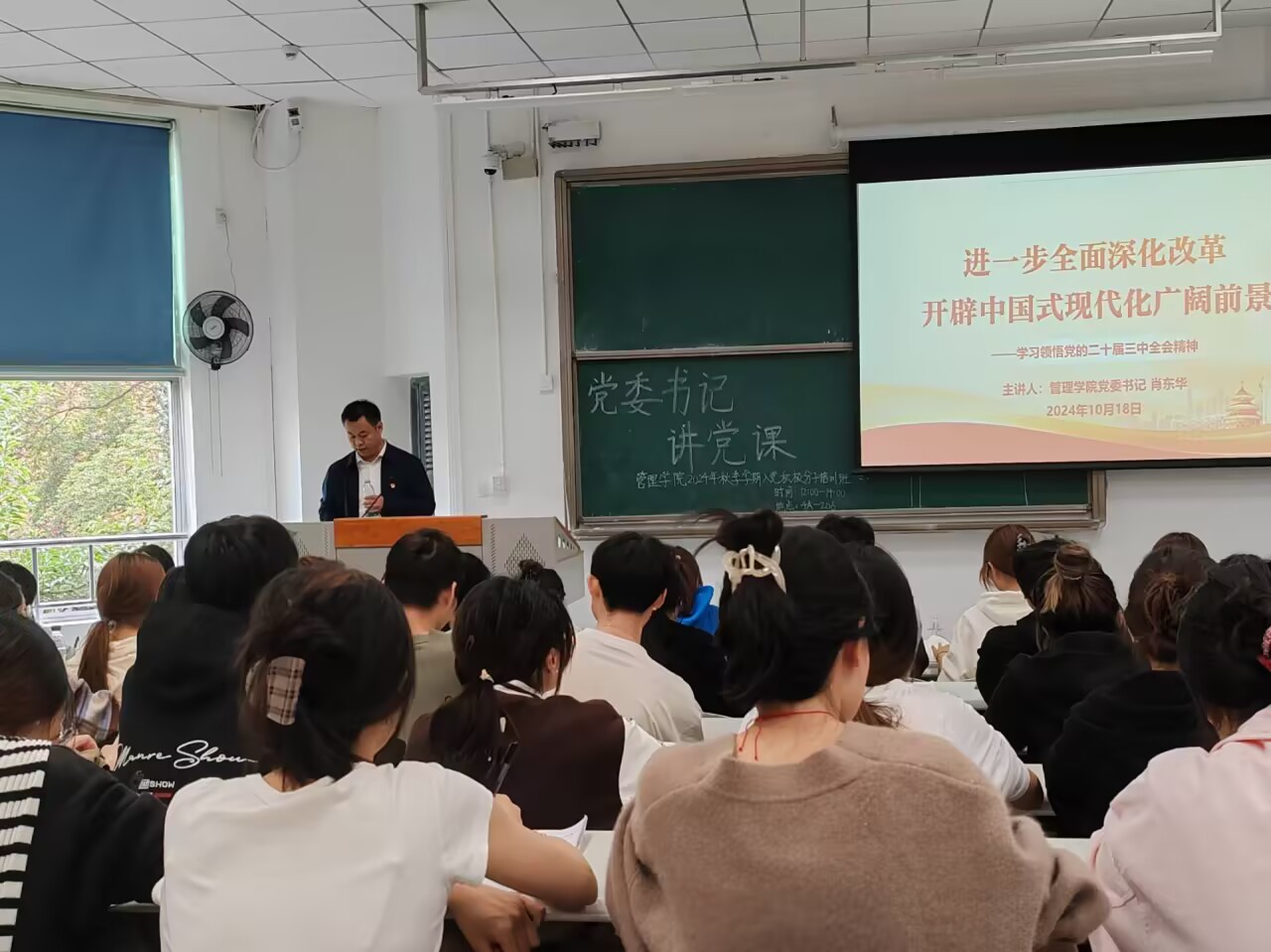 为深入学习贯彻党的二十届三中全会精神,提高同学们的党性修养和思想政治素质。20241018日中午,西华大学管理学院党委书记肖东华在4A-206为入党积极分子培训班的学员们讲授“进一步全面深化改革,开辟中国式现代化广阔前景”专题党课。管理学院入党积极分子培训班指导教师黄婉君出席会议,管理学院2024年秋季学期入党积极分子培训班全体干部及学员到场参加本次党课学习。