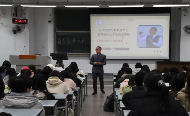 讲座伊始,唐文立导师深入分析了当前大学生就业形势的严峻性,包括就业技能供需错配、数字化能力不足、岗位竞争与替代风险大、行业需求分化等问题。他强调,管理方向的大学生必须认清就业环境,把握数字化转型与智能管理、战略决策与可持续发展、跨境管理与全球化运营、公共服务与社会创新等四大重点方向。随后,唐立文导师还分享如何通过构建“管理+技术”复合能力、积累实战经验、创新求职策略等方法,进行能力升级与策略实施。他鼓励大学生灵活运用就业支持政策,加入垂直社群,善用行业联盟,以聚焦个人核心竞争力,把握求职新兴赛道,利用政策优势,实现高质量的就业发展。最后,针对同学们提出的疑问、想法和认识,唐立文导师一一给予了回复。