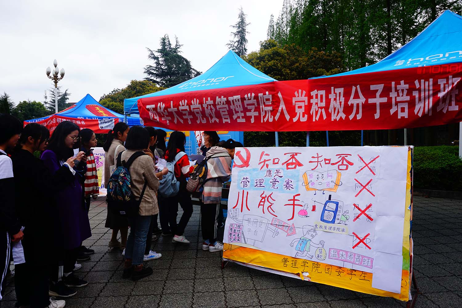 4月2日,西华大学党校第42期管理学院班在明德广场顺利开展了以“知否知否,应是管理竞赛小能手”为主题的社会实践活动,此次活动旨在倡导大学生做一名“新时代知识青年”,提高大学生金融防骗和抵御风险的能力。党校全体学员参加,全校同学参与。