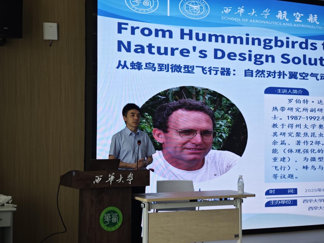 2025年6月27日14点,由西华大学航空航天学院主办的空天大讲堂学术讲座在招生与就业处报告厅401成功举行,电子科技大学航空航天学院、四川大学空天科学与工程学院、西南交通大学力学与航空航天学院、西华大学能源与动力工程学院、西华大学侨联共同承办了此次讲座。讲座以“From Hummingbirds to Microair Vehicles: Nature's Design Solution to Flapping Wing Aerodynamics(从蜂鸟到微型飞行器:自然对扑翼空气动力学的工程设计解法)”为主题,特邀加州大学伯克利分校综合生物学系教授、史密森热带研究所研究员Robert Dudley担任主讲嘉宾,本次讲座由李秋实校长主持,学院院长江启峰、党总支副书记余莎莎及200余名来自西华大学航空航天学院、电子科技大学航空航天学院、四川大学空天科学与工程学院、西华大学能源与动力工程学院等院校的学生参加。讲座开始前,主持人李秋实校长对Robert Dudley教授的莅临表示热烈欢迎,并简要介绍了罗伯特教授的主要成就。
