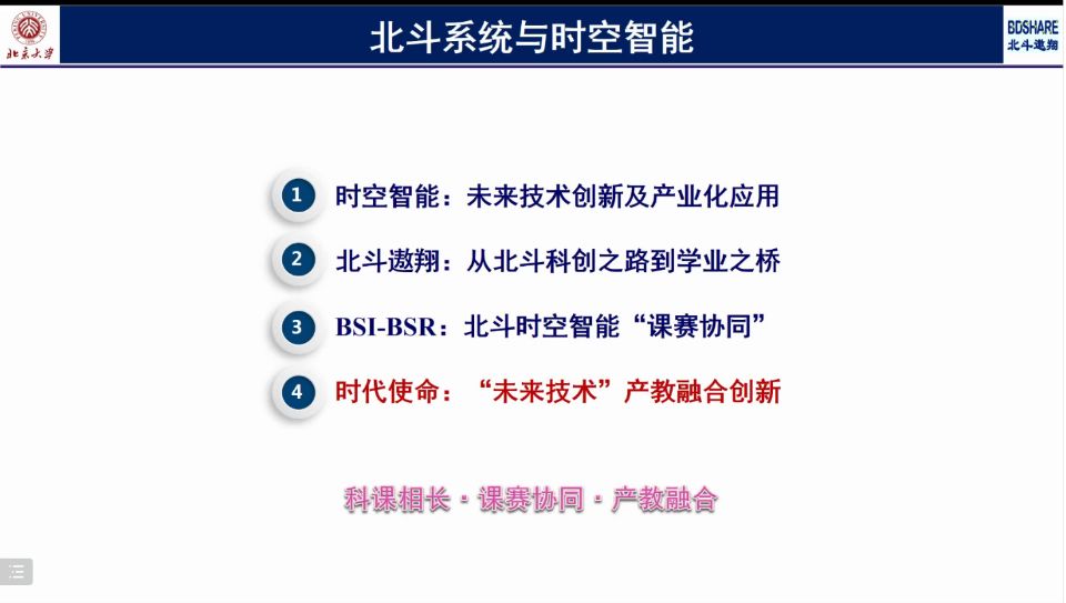首先,陈秀万教授围绕时空智能、北斗翱翔、BSI-BSR(课赛协同)和时代使命四个方面,详细、系统地讲解了北斗系统和时空智能之间的联系和相关知识。陈秀万教授介绍到,北斗系统是中国自主卫星导航系统,是世界四大全球导航卫星系统之一,正是有我国无数航空航天科研人员的不懈努力,才能有我国在国际上拥有导航方面的底气。陈教授说,在未来,当传统资源走向末路,新资源将成为各国战略上的必争之地,这个新资源就是高素质的人才,因为高质量的人才是推动技术变革的原动力。