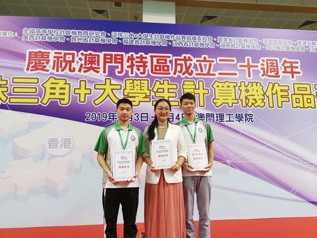 7月2日—5日,由全国高等学校计算机教育研究会及泛珠三角大学生计算机作品赛组委会共同举办的“2019年泛珠三角大学生计算机作品赛本科组总决赛”在澳门举行。由我校计算机与软件工程学院周立章老师、牛宪华老师指导的3名同学在此次比赛中荣获本科组三等奖和最佳展示奖。