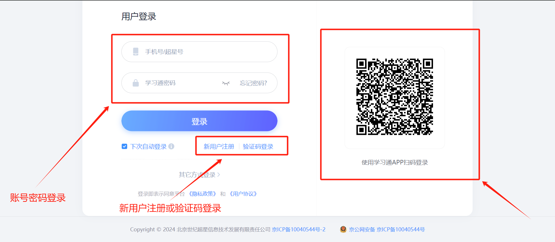 2、打开后会跳转到登录页面,若已有学习通账号可直接输入账号密码或扫码登录,没有的话可以注册或手机验证码登录。