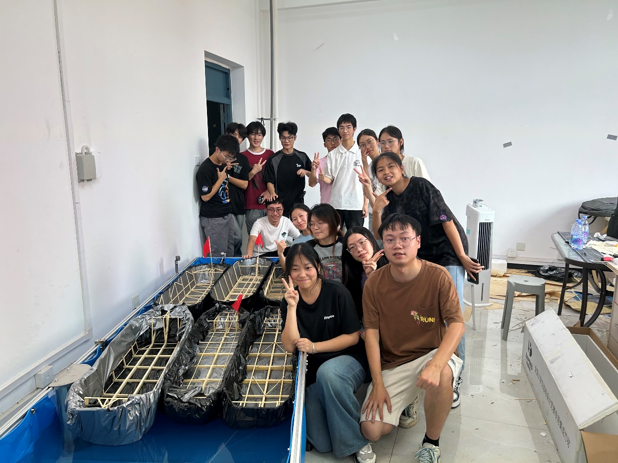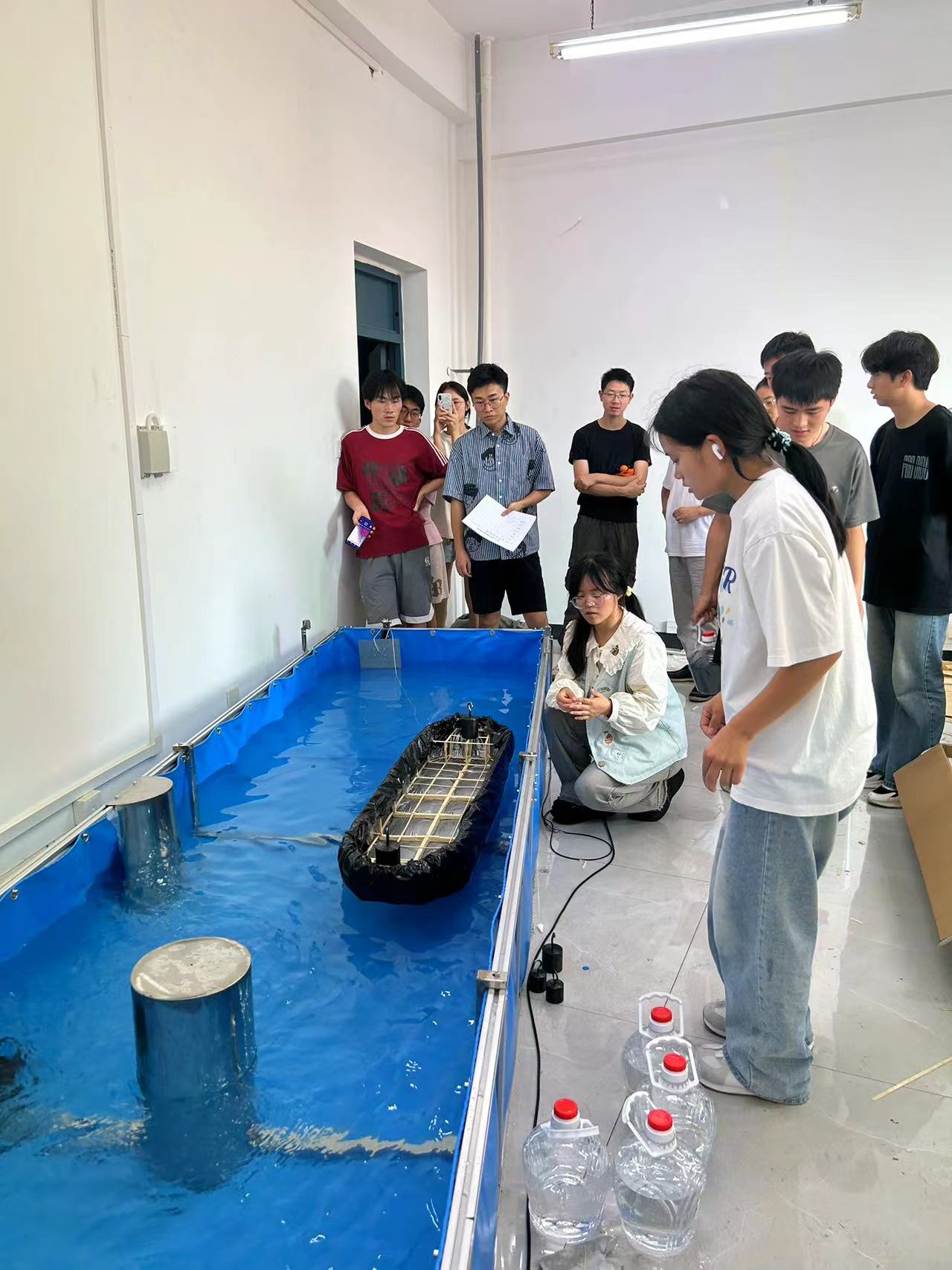 轻巧过关显功底:“国阳大队”( 队员:唐伟峰、王枭、刘国阳,指导老师:邹宇)凭借轻巧灵动的船只设计,成功通过了关键的三级静载测试,展现了扎实的基本功。