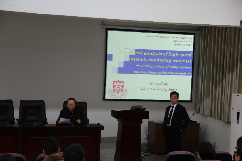 2019年3月12日上午,应能动学院\重点实验室邀请,日本大学彭国义教授来到我校进行学术交流,并作了题为“Numerical analysis of high-speed unsteady cavitating water jet”的学术报告。报告会由学院赖喜德书记主持,学院部分教师及研究生参加了报告。