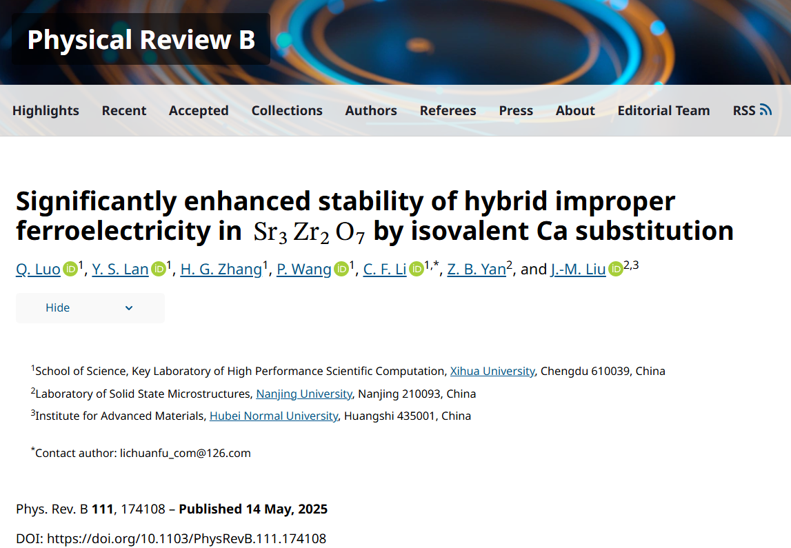 近日,理学院物理学科青年教师李川福在国际物理学领域权威期刊《Physical Review B》期刊发表题为“Significantly enhanced stability of hybrid improper ferroelectricity in SrZr2O7 by isovalent Ca substitution”的学术论文。西华大学为该论文的第一完成单位。西华大学理学院李川福博士为该论文的通讯作者,2022级硕士生罗倩为论文第一作者。