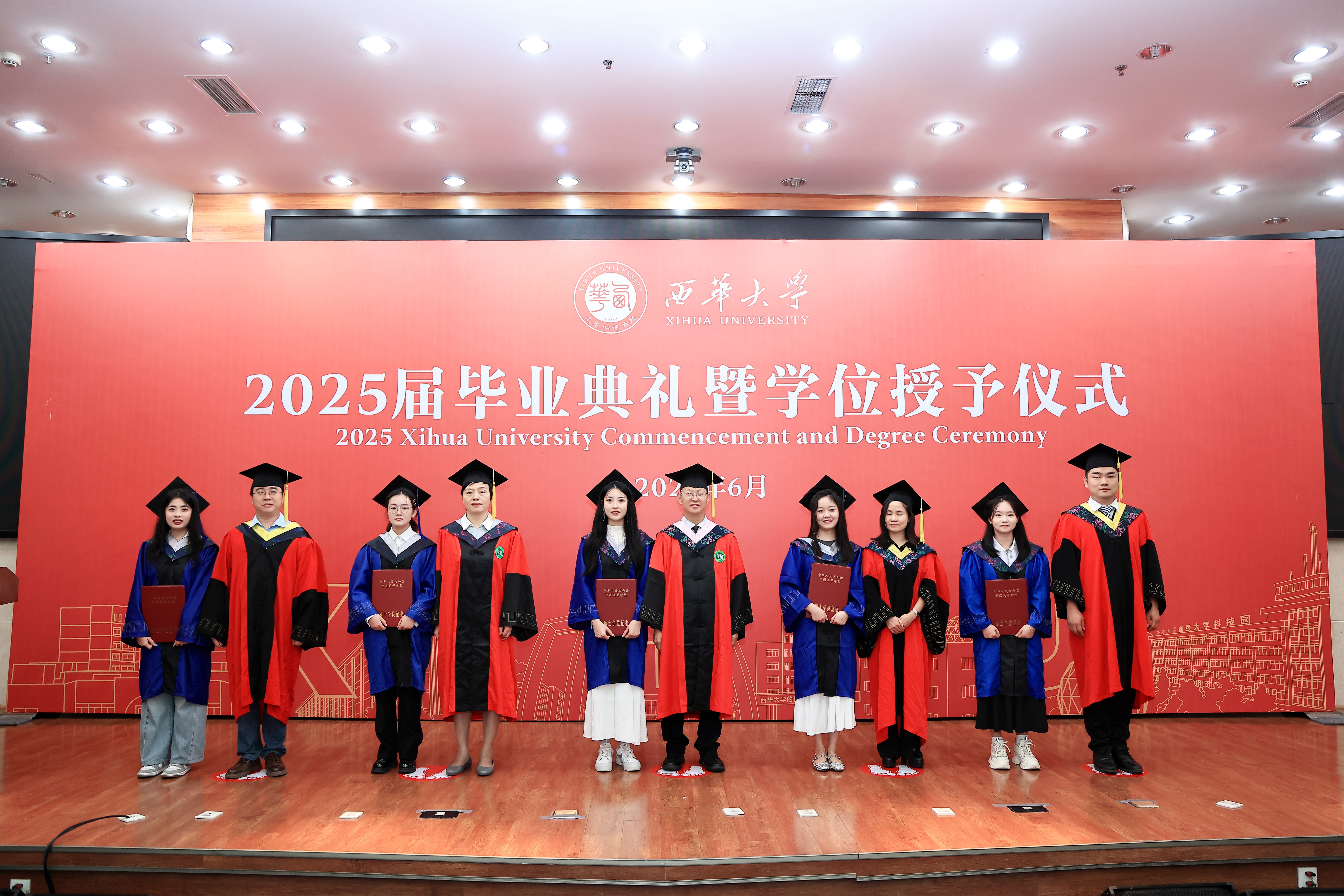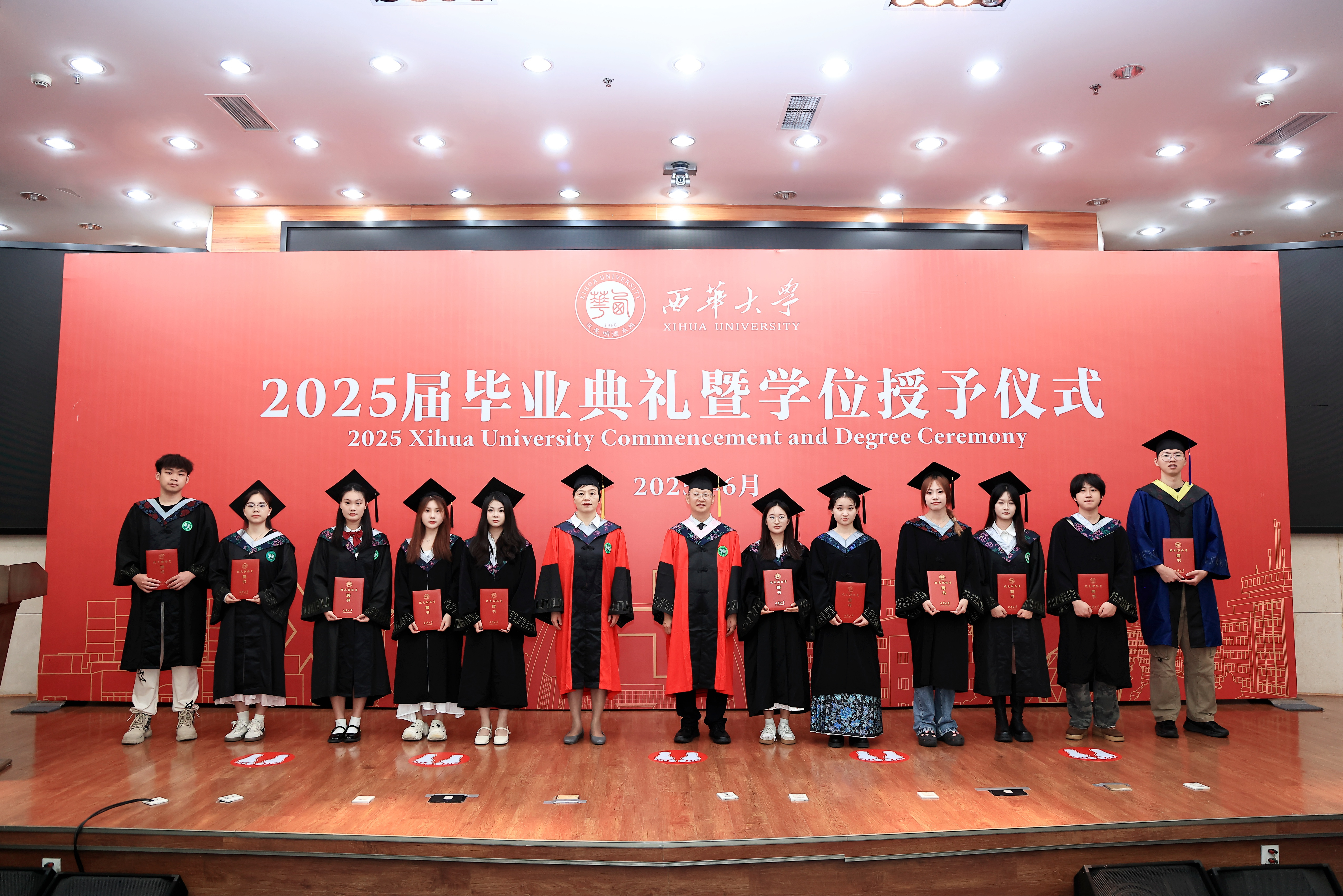 随后,毕业生们身着整齐学位服,以5人为一组依次上台。西华大学副校长王永杰、理学院院长王周玉、学院副院长李会东、学院副院长王玉兰、物理系副教授范志祥依次为获得学位的毕业生们进行授位拨穗仪式。完成拨穗礼后,毕业生们手持学位证书,与老师们合影留念,脸上洋溢着喜悦与自豪,现场氛围温馨而热烈。
