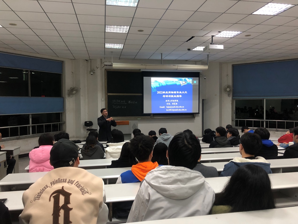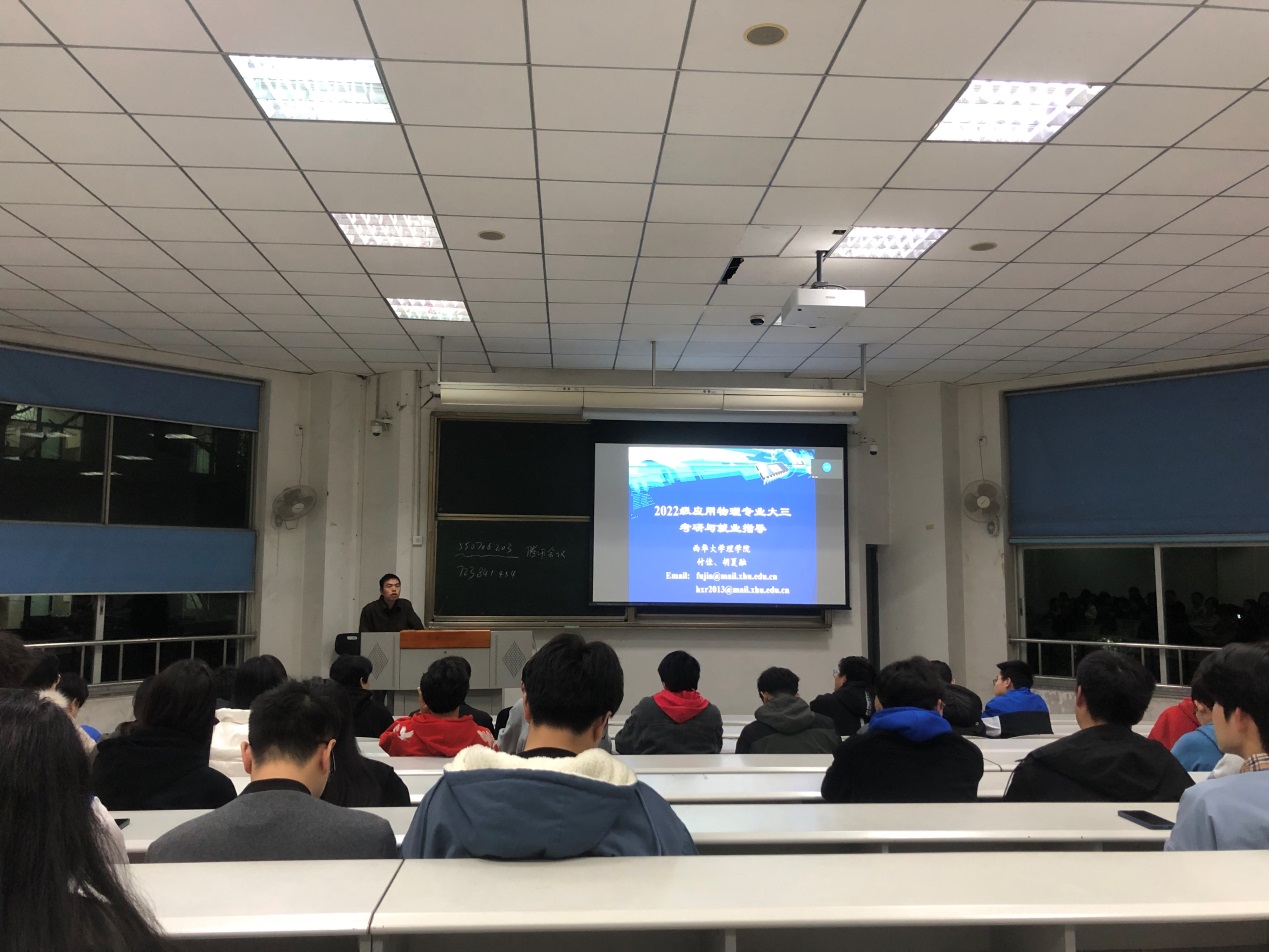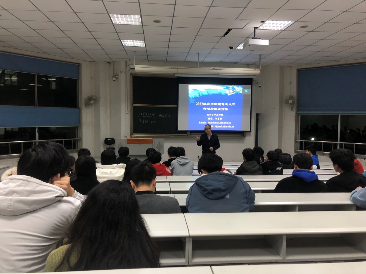 会上,付佳老师和胡夏融老师先后分享了物理专业近年来的考研和就业数据,并介绍了物理学科的师资以及研究方向等情况;随后,三位优秀校友围绕就业依次分享了他们的经验,并用自己的亲身经历告诉同学们,在求职过程中如何发掘自己的优势,如何准确定位自己的求职方向,以及如何提升自己的实力和能力,并鼓励同学们不要轻言放弃,坚持到底,相信自己能够拿到中意的offer。接着在互动交流环节,专业教师对在场同学关于考研的疑惑一一进行了解答。