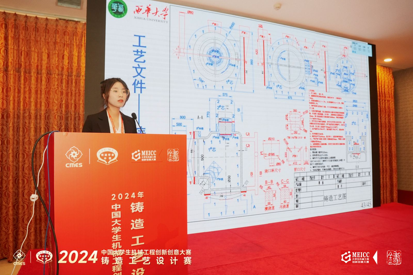 我校学生从2023年10月接受比赛题目,持续到今年7月全国总决赛,时间周期长,任务重,强度大。参赛同学在老师的指导下,积极备战,一边刻苦学习铸造工艺设计理论知识,一边积极深入生产现场,了解铸造生产实际、调研交流,精心准备。比赛涉及内容几乎函盖了整个铸造专业知识,设计内容包括零件材质要求、结构分析、主要生产技术要求(造型、熔炼、浇铸、热处理等)、工艺方案、工艺说明、参数、工艺图和工艺卡、铸件质量控制(缺陷的预防措施)等;参赛选手使用三维造型软件造型设计,提供零件和铸造工艺的三维造型图,对工艺方案进行计算机数值模拟,并进行分析和验证,借助模拟软件对工艺方案进行优化。同学们在答辩现场和知识竞赛时沉着冷静,从容作答,敢于拼搏,充分展现了自己所掌握的专业知识和综合素养,赛出了西华学子的风采。