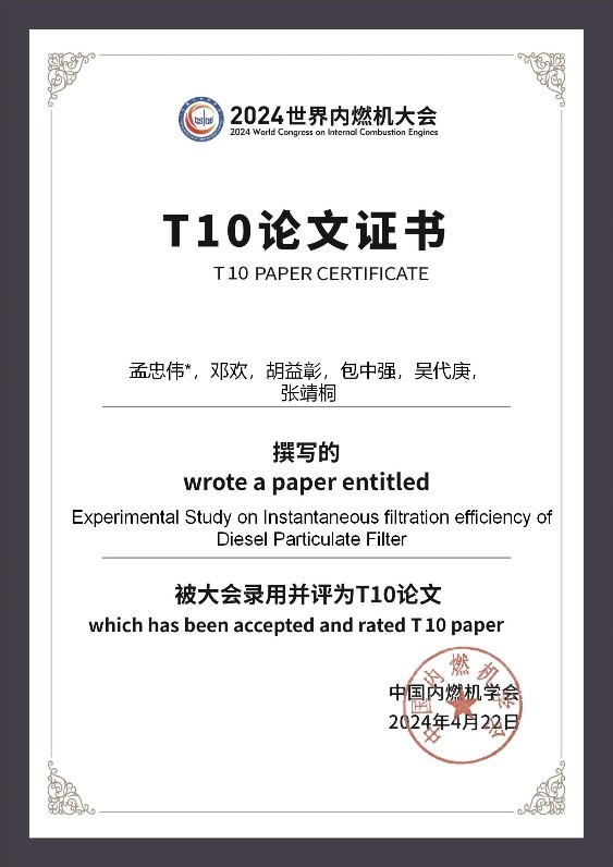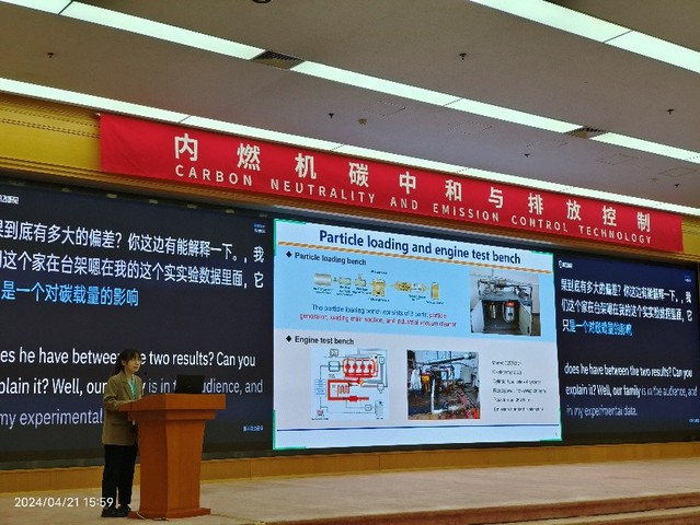 邓欢在“内燃机碳中和与排放控制”分会上进行英文宣讲,报告题目为《Experimental Study on Transient Filtration Efficiency of Diesel Particulate Filter》。该报告介绍了不同来流和载体条件对柴油机颗粒捕集器(DPF)过滤效率的影响,为制定减少DPF出口颗粒物排放的策略提供了理论参考。该报告引起了国内外同行的广泛关注,并荣获T10优秀论文证书。