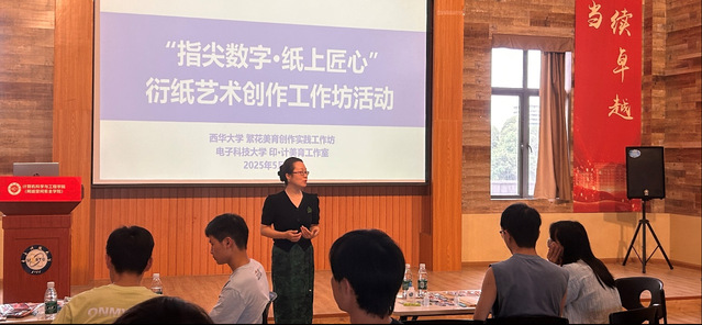 技法教学环节将现场氛围推向高潮,左怡老师带领赵知合、张彬翌、胡逸飞三位同学,展示了以川剧旦角头饰为灵感、融合电路板元素的非遗主题平面作品。“没想到冰冷的电路板图案可以通过温暖的衍纸艺术来表现,”一位计算机专业的同学感慨道,“在专注卷纸的过程中,我感受到了久违的快乐体验。”这种将传统非遗与现代科技相结合的创新模式,不仅让同学们领略了衍纸艺术的独特魅力,更让他们在创作中获得了愉快的心理疗愈体验。