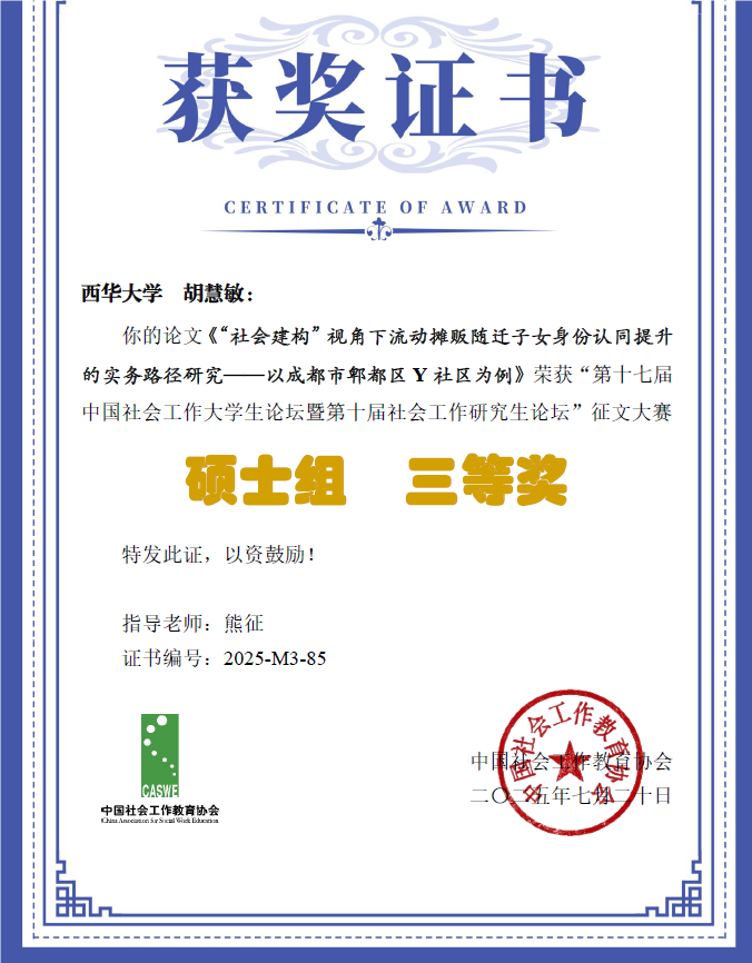 在此次全国性学术交流中,我校法学与社会学学院2023级社会工作硕士研究生胡慧敏,在熊征教授指导下,完成的《社会建构视角下流动摊贩随迁子女身份认同提升的实务路径研究——以成都市郫都区Y社区为例》表现突出,荣获三等奖。