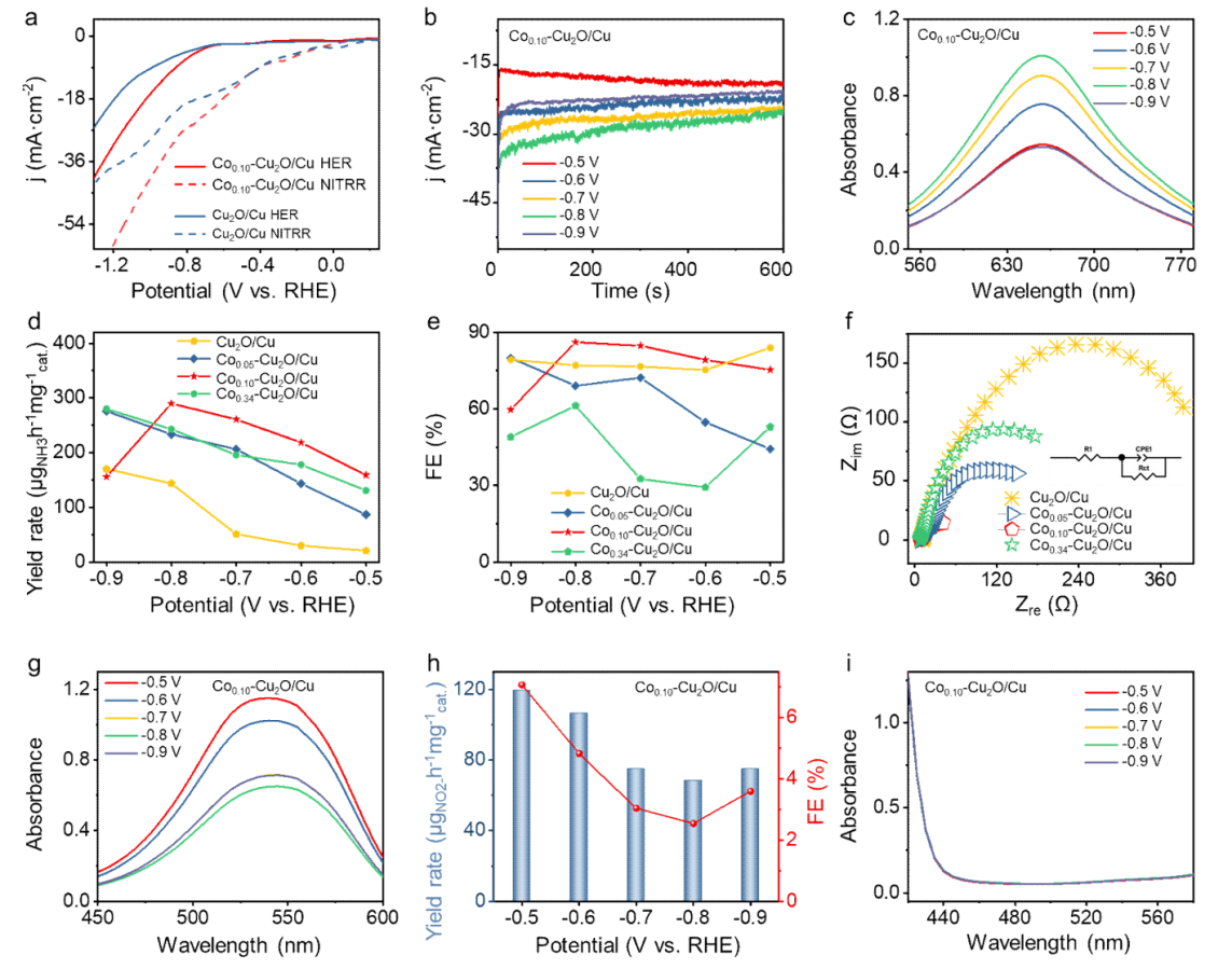 本文通过一种简单、快速、环境友好且无能耗的化学置换法,制备了一系列具有不同Co掺杂浓度的纳米枝晶状Cu2O/Cu异质结材料(Cox−Cu2O/Cu, x = 0.05、0.10或0.34)。通过调控Co的掺杂浓度,成功实现了Cu₂O/Cu异质结界面处Co掺杂形式从原子态向单质态的可控转变。实验结合理论计算研究表明,掺杂原子态Co增强了硝酸根反应物种在催化剂表面的吸附强度,而掺杂单质态Co有利于*H的生成。*H是NITRR合成NH3的关键活性物种,其浓度对FENH3有显著影响。具体来说,*H的浓度不足会减缓NITRR产NH3的动力学过程,而浓度过高则会诱发剧烈的HER副反应,导致产NH3的选择性降低。因此,调控Cu基催化剂表面的*H浓度,使其在NITRR产NH3过程中达到产生和消耗之间的动态平衡是至关重要的。因此,我们通过对纳米枝晶状Cu2O/Cu异质结材料中掺杂Co浓度的调节,实现了Co掺杂形式(原子态和单质态)比例的调控,从而能有效地调节枝晶状Cu2O/Cu异质结材料界面处*H的浓度。得益于Cu2O/Cu 异质结界面处*H浓度的调节,使得电化学NITRR产NH₃过程中*H的产生和消耗之间维持了动态平衡,从而显著促进了电化学NITRR产NH₃的动力学过程。基于上述优势,所制备的Co0.10-Cu2O/Cu催化剂在-0.7 V vs RHE的电压下,电化学NITRR为NH3的产率为290.0 μmol·h⁻¹·mg⁻¹cat,法拉第效率(FENH3)为86.2%,其性能显著高于初始的Cu2O/Cu催化剂的性能(NH3的产率为51.0 μmol·h⁻¹·mg⁻¹cat.,FENH3=32.5%)。此外,Co0.10-Cu2O/Cu催化剂表现出显著的稳定性,在连续的循环稳定性测试和长时间耐久性评估中,其催化活性无明显衰减。