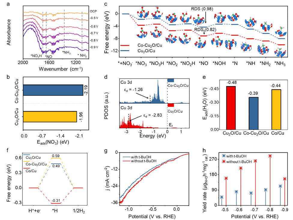 图5. 原位红外光谱结合密度泛函理论计算分析电催化NITRR合成氨机制。