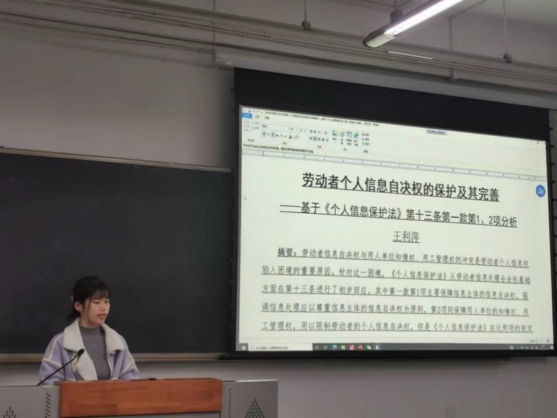 王利萍同学报告的题目为《劳动者个人信息保护自决权的保护及其完善——基于个人信息保护法第十三条第一款第1、2项分析》。王利萍同学围绕劳动者的个人信息自决权,对个人信息保护法的相关规定进行分析,为平衡劳动者信息自决权与用人单位知情权、用工管理权之间的矛盾,提出建议。