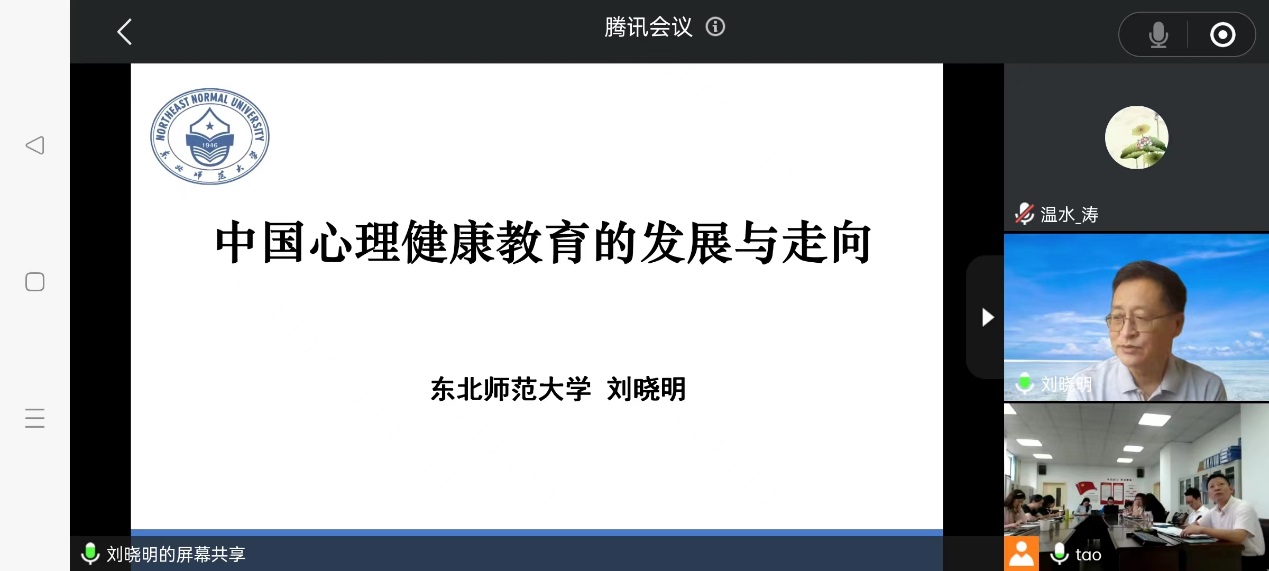 心理健康教育中心邀请东北师范大学心理学院教授、博士生导师、东北师范大学心理健康教育研究中心主任刘晓明,2022年9月29日上午线上为心理健康教育中心的专兼职教师作“中国心理健康教育发展与走向”学术报告。报告会由心理健康教育中心王强主任主持,心理健康教育中心全体教职员工、学校部分学生心理健康教育兼职教师参加了报告会。