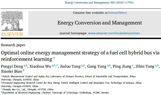 Optimal online energy management strategy of a fuel cell hybrid bus via reinforcement learning”(Energy Conversion and Management)论文第一作者为团队成员邓鹏毅副教授,通讯作者为团队负责人武小花教授。该论文提出一种基于强化学习的燃料电池混合动力公交车多目标能量管理策略,用于优化燃料电池电动车辆实车在线能量调度。