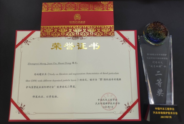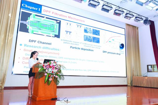 研究生欧娟在会场用英文宣读了题目为:Study on filtration and regeneration characteristics of diesel particulate filter (DPF) with different deposited particle layers(不同沉积颗粒层的柴油机微粒过滤器过滤与再生特性研究)的论文,受到业内广泛好评,该论文被评选为此次大会的优秀论文二等奖。