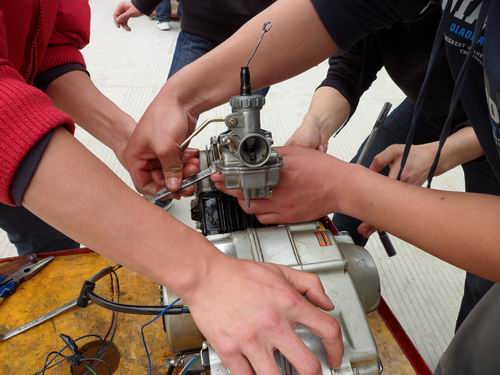 两个小时后,选手按抽签决定的序号依次进入赛场。经过了专业的培训,他们个个都摩拳擦掌,迫不及待地想自己动手实践。随着总裁判一声令下,参赛选手们展开了激烈的角逐,各队队员分工合作,将自己的理论知识融入实际操作中,充分利用刚学到的拆装技巧,通过相互巧妙的配合,以最快的速度向发动机“进攻”。就连平时娇弱的女生此时在笨重的发动机前也显示出别样的风姿。因为绝大多数选手是第一次拆装发动机,所以比赛过程并非一帆风顺,但团队的力量使得大家拧成一股绳,最终顺利的完成了比赛任务。