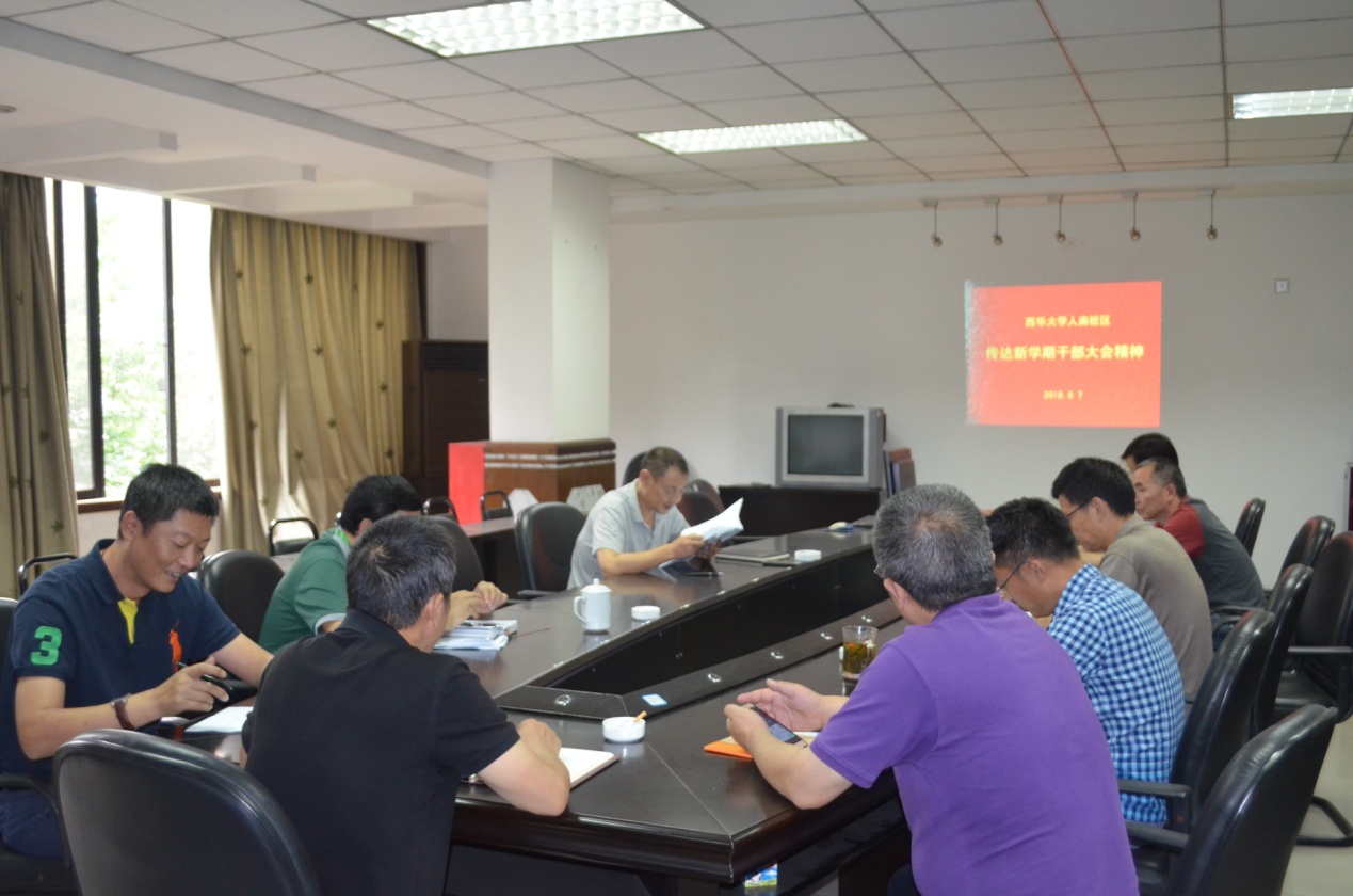9月7日下午,人南校区召开了全体教职工大会,传达全校干部大会精神。会上,校区党委副书记、常务副主任蒲华庆传达了边书记《统一思想 凝聚共识 以高度的责任感和使命感推进学校改革发展》的讲话精神和刘校长关于学校发展面临的机遇与挑战的分析以及本学期主要工作等内容。