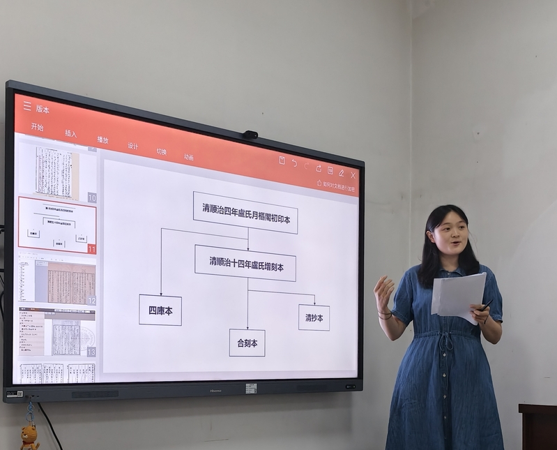 6月20日上午,学院中国古典文献学方向第十八期“丽泽”读书会于6A-111会议室如期举行。本次读书会由2023级研究生杨婷主持,谭佳同学担任领读,古典文献学专业2023、2024级研究生参与讨论,王燕飞老师作为特邀嘉宾出席指导。