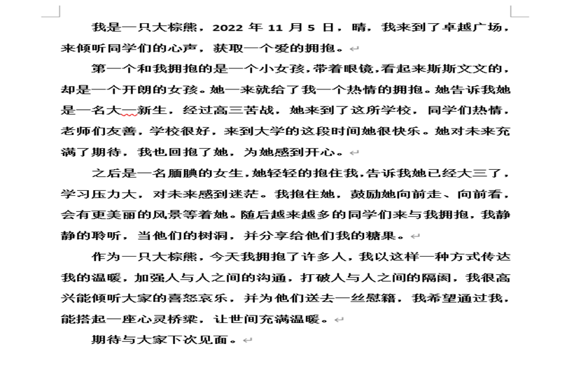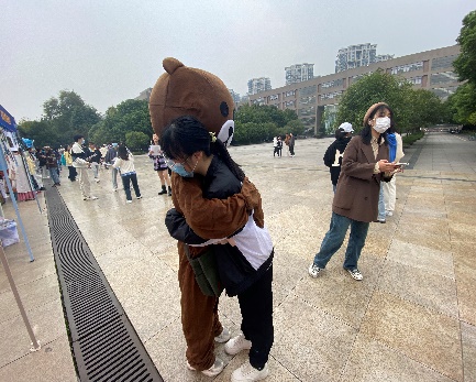 上午九时,相关工作人员在卓越广场设立点位,由部门成员穿着玩偶服与路过的同学拥抱,随后给与拥抱的同学小零食并送出温暖的鼓励与祝愿。路过的同学们纷纷积极参与此次活动,其中很多同学都表示感受到了来自陌生人的温暖,并将自己想对陌生人说的话写在了便利贴上,希望将爱和温暖传递下去。