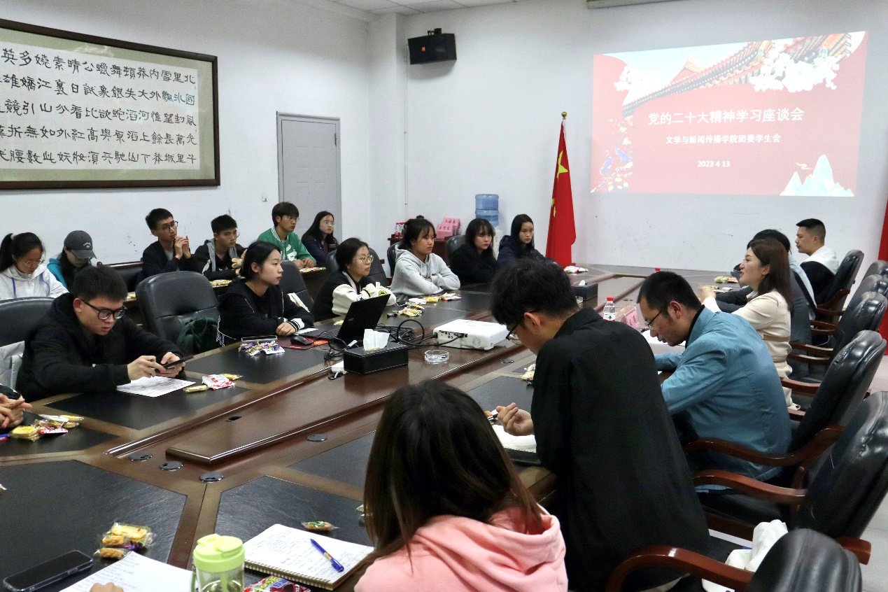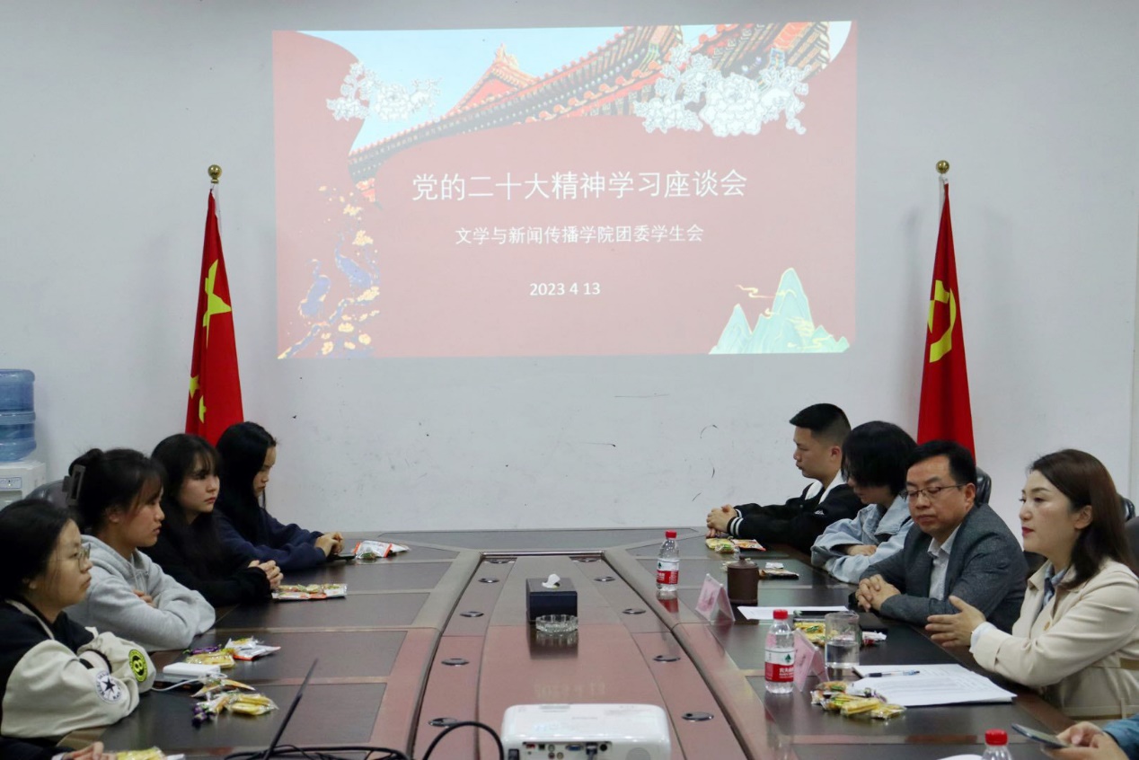 4月13日下午,文新学院在6A108会议室组织召开了党的二十大精神学习座谈会。学院党委书记王莉、党委副书记徐攀,团委书记陈柄志,团委学生会全体学生干部参加了座谈会。