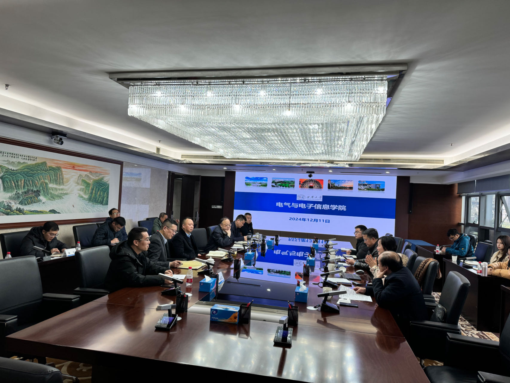 雷霞院长介绍了电气与电子信息学院的基本情况,同时结合省水电集团实际需求,分享了学院近年来在风光出力及负荷特性分析、电力市场交易、电网智能运维等方面取得的最新科研成果。阎铁生副院长从电力电子装备的角度,展示了学院在电能质量治理、储能系统研制等方面的进展。曹太强教授简要汇报了团队在新能源发电并网方面的研究工作。
