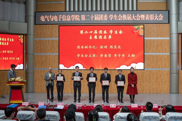 11月18日中午,电气与电子信息学院第二十届团委 学生会换届大会暨表彰大会在四教报告厅召开。本次大会由团委 学生会文娱部干事戴子尧主持,电气学院党委副书记郭忠林、学工办主任刘钊、团委书记叶露、辅导员刘秀丽、赵薇、康濛、刘益丰、陈莎莎及第二十届团委 学生会全体成员参会。