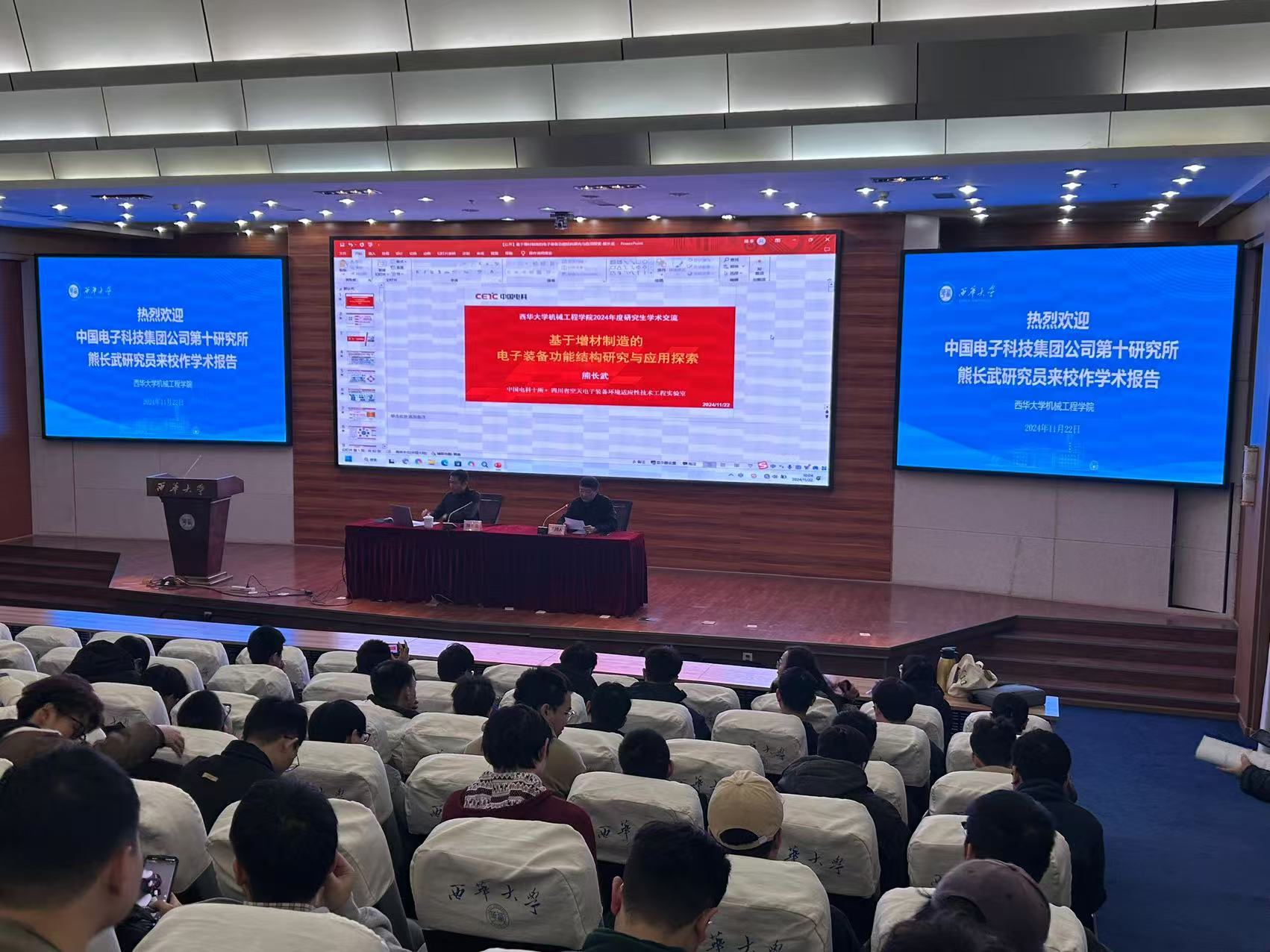 2024年11月22日上午10:00,中国电子科技集团公司第十研究所副总工程师熊长武应邀在图书馆报告厅作题为“基于增材制造的电子装备功能结构研究与应用探索”的报告。会议由机械工程学院副院长朱维兵主持,学院及学校相关领域师生参加。