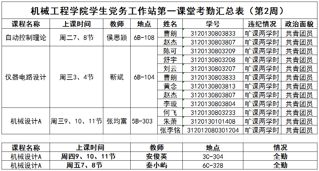 【考勤公示】机械学院学生第一课堂(第2周)考勤公示
