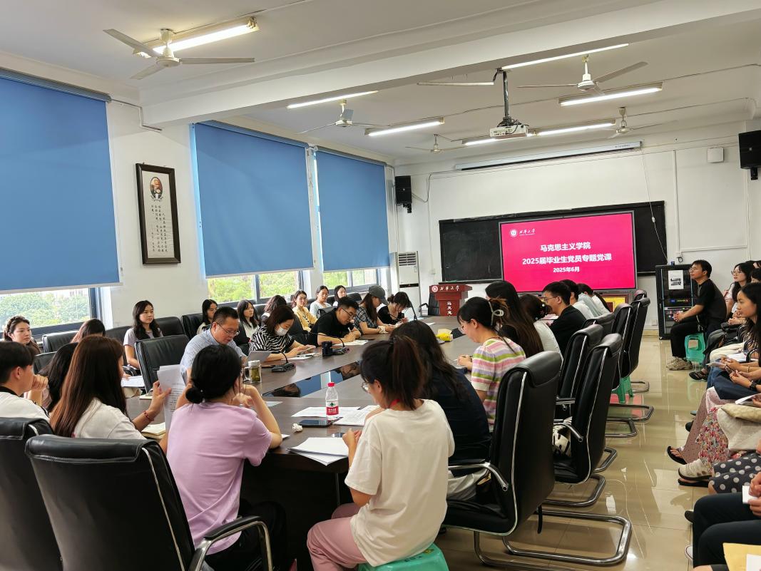 为进一步坚定毕业生党员理想信念,强化党员意识与责任担当,更好发挥毕业生党员的先锋模范作用。6月23日下午,马克思主义学院开展2025届毕业生党员专题党课。学院党委书记万远英,学院党委副书记、纪委书记石元鹏为学院毕业生党员讲授大学阶段“最后一课”。专题党课由学院党委委员、专职组织员翟元平主持,学院2025届全体毕业生党员参加学习。