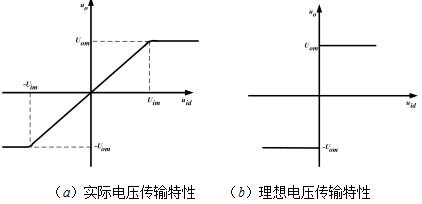 图2(b)为集成运放的理想电压传输特性,该理想电压传输特性显示了运算放大器作为电压比较器的工作方式,可用于判别u+和u-电位的大小。