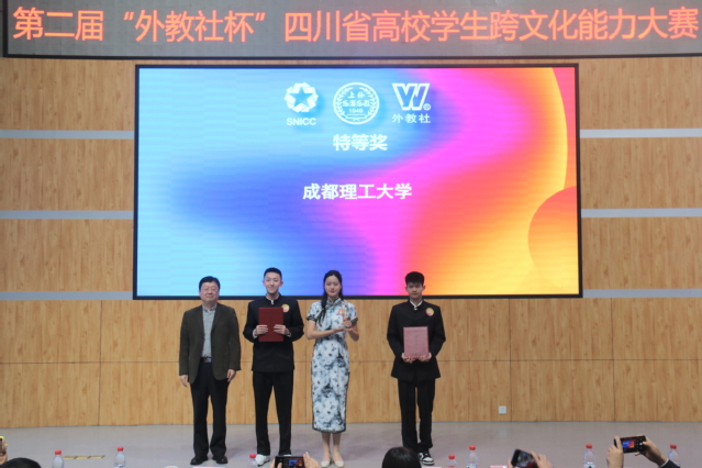 首先,四川省普通本科高等学校外国语言文学类教学指导委员会主任委员、四川大学段峰教授代表全体评委进行大赛宣誓,随后主持人介绍了本次比赛规则。比赛正式开始后,十支参赛队伍依次进行了知识竞答、情景评述和讲述中国故事三个环节的比拼,他们的精彩表现充分展现了当代大学生对世界文化多样性的理解和尊重,对中国文化的热爱与自信。经过激烈地角逐,成都理工大学荣获本次大赛特等奖,四川大学荣获一等奖,分别将代表四川省参加12月于长沙举办的全国总决赛。