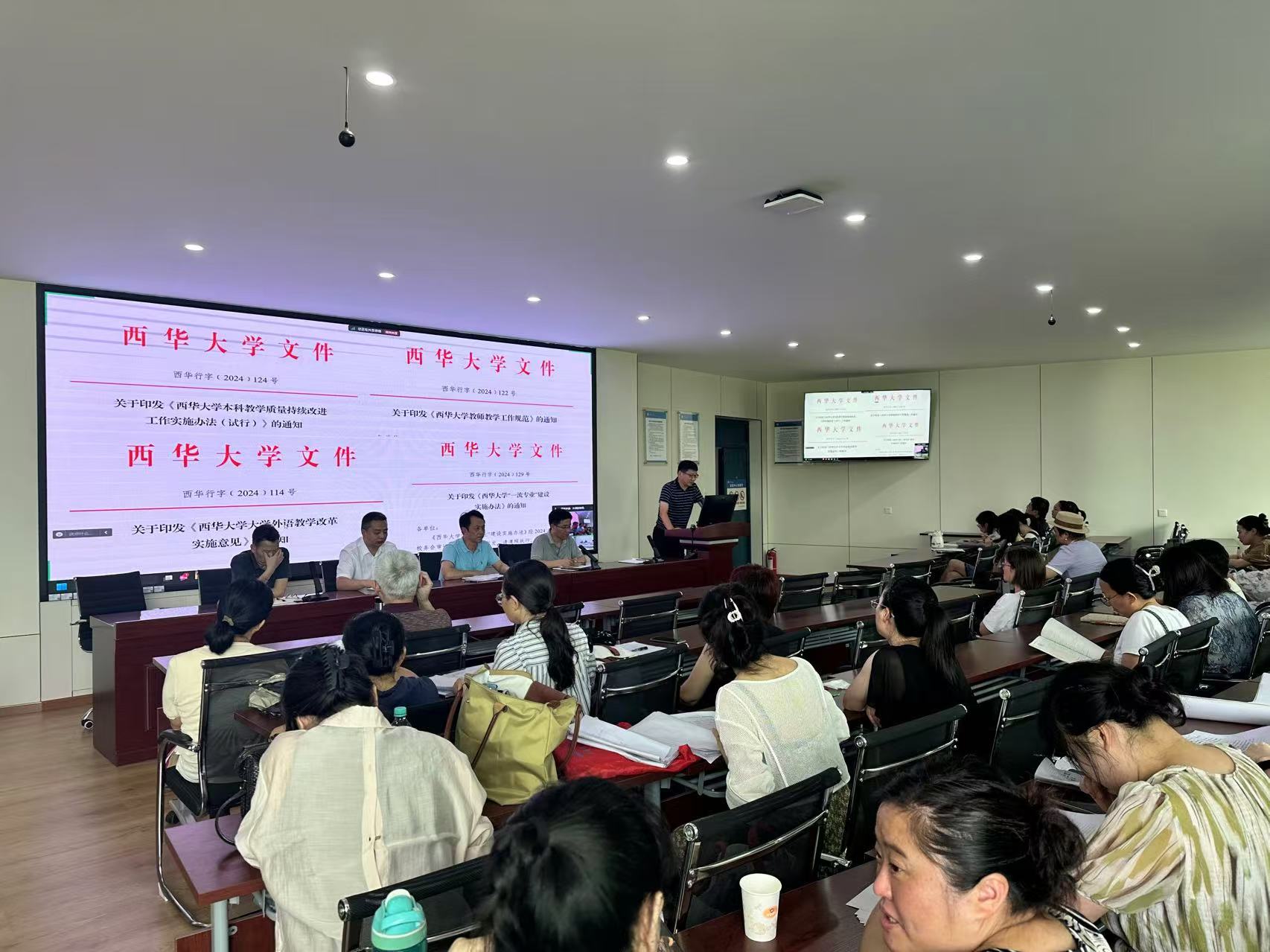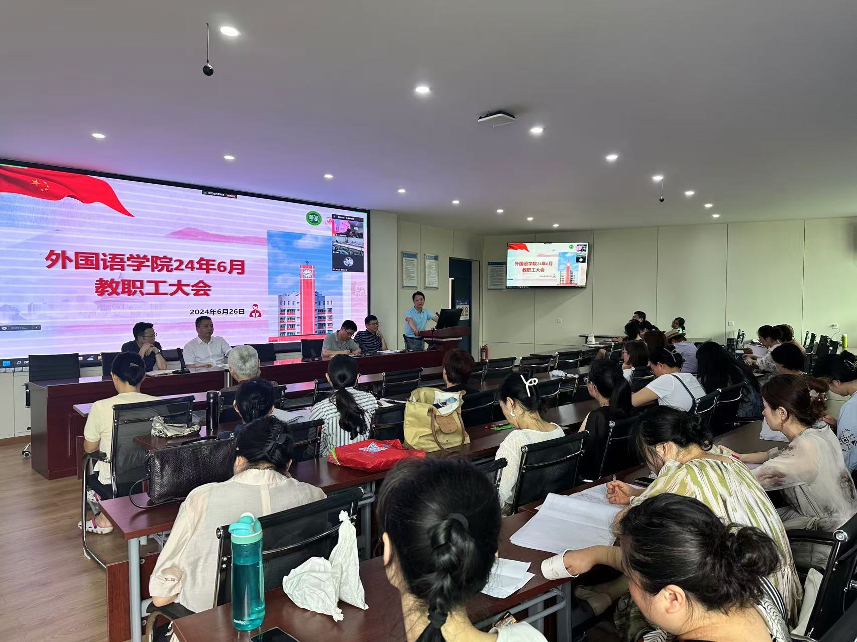2024年6月27日下午,外国语学院全体教职工大会在郫都校区4C504和宜宾校区会议室同步召开,会议由院长李国宏主持。此次会议重点对近期学院各项工作进行了部署,并组织了教职工政治理论学习。
