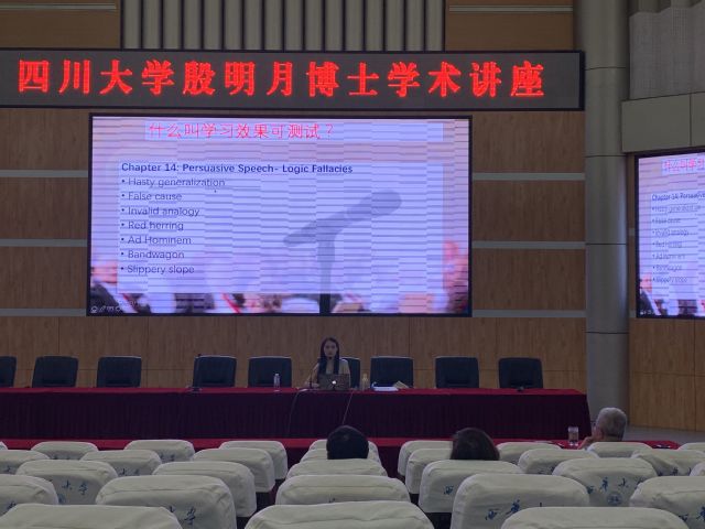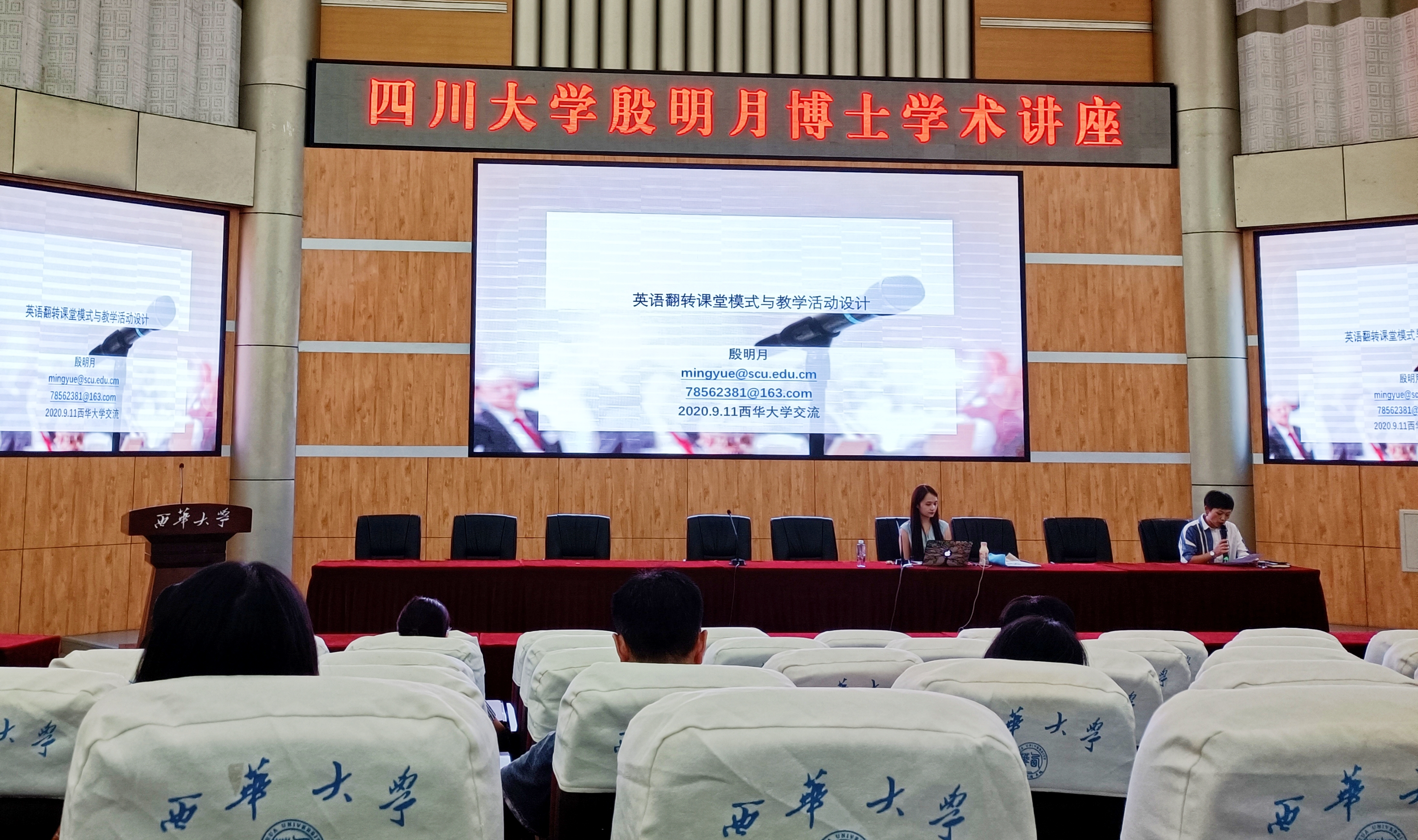 2020年9月11日下午14:00—16:00,四川大学殷明月博士应邀于西华大学四教报告厅开展了关于“英语翻转课堂模式与教学设计活动设计”的学术讲座。讲座由外国语学院副院长董小莉主持,参加此次讲座的主要有外国语学院的教师、2019级翻译硕士研究生。