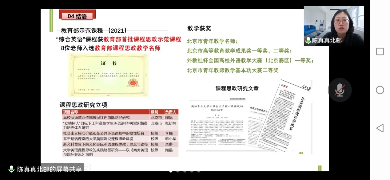 2022年5月13日14:30-17:30,北京邮电大学人文学院副院长陈真真教授受我院邀请,携北邮英语教学、一流课程负责人等给我院英语教师进行了“立德树人、技术赋能——北京邮电大学大学英语改革实践探索”的学术讲座,并进行了研讨。