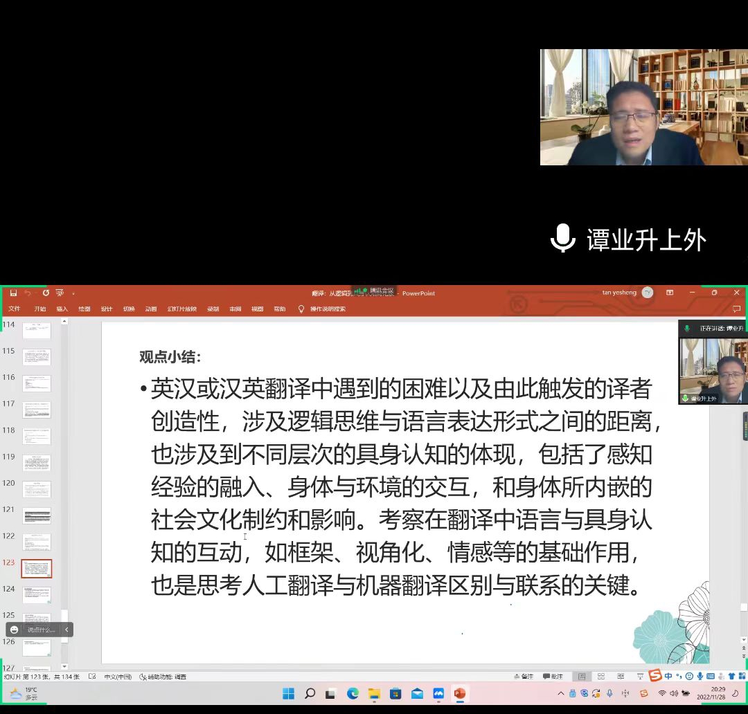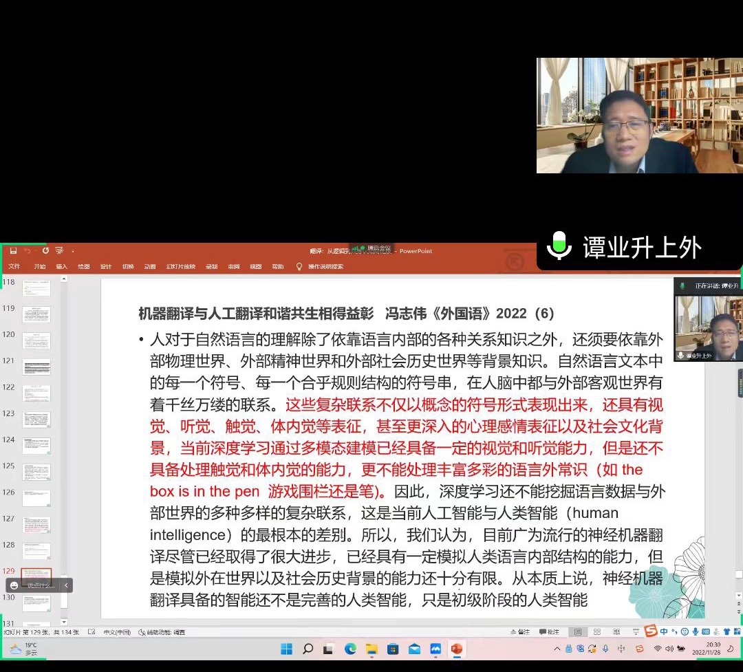 11月28日晚上19:00谭教授以《翻译:从逻辑到具身认知》为题给西华大学外国语学院研究生带来了精彩的学术报告,在线参加的师生近200名。