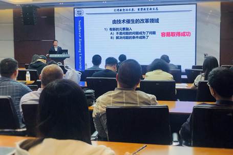 为贯彻落实教育数字化战略行动,进一步推进教育教学数字化转型,以观念转变引领行动变革,破解教师教学如何以问题导向找准关键领域,4月11日下午三点,西南交通大学力学与航空航天学院教授、国家级教学名师龚晖在行政楼101会议室为我校教师带来了主题为“引得数智活水来,重塑教育新生态”的精彩讲座。本次培训由教务处(教师教学发展中心)组织开展,教师教学发展中心主任刘雪梅主持,校内60余位教师参加了本次培训。