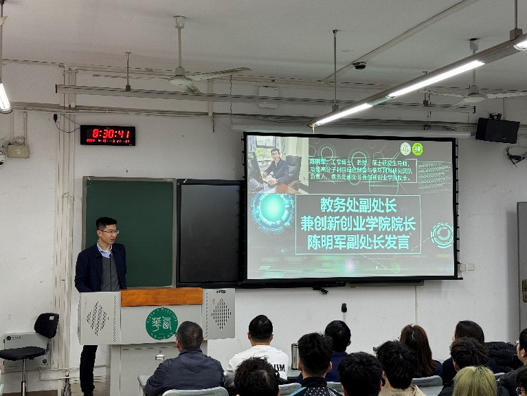 在热烈的掌声中,向大家介绍了汽车与交通学院副院长何太碧教授和教务处副处长兼创新创业学院院长陈明军教授。陈明军教授在大会上发表了鼓舞人心的讲话,他强调了交通运输科技在推动社会发展和环境保护中的重要作用,并鼓励学生们积极参与科技创新,勇于探索未知,为实现绿色、智能的交通系统贡献青春力量。陈教授的话语充满了对年轻学子的期望和信任,极大地激发了学生们的参与热情和创新动力。