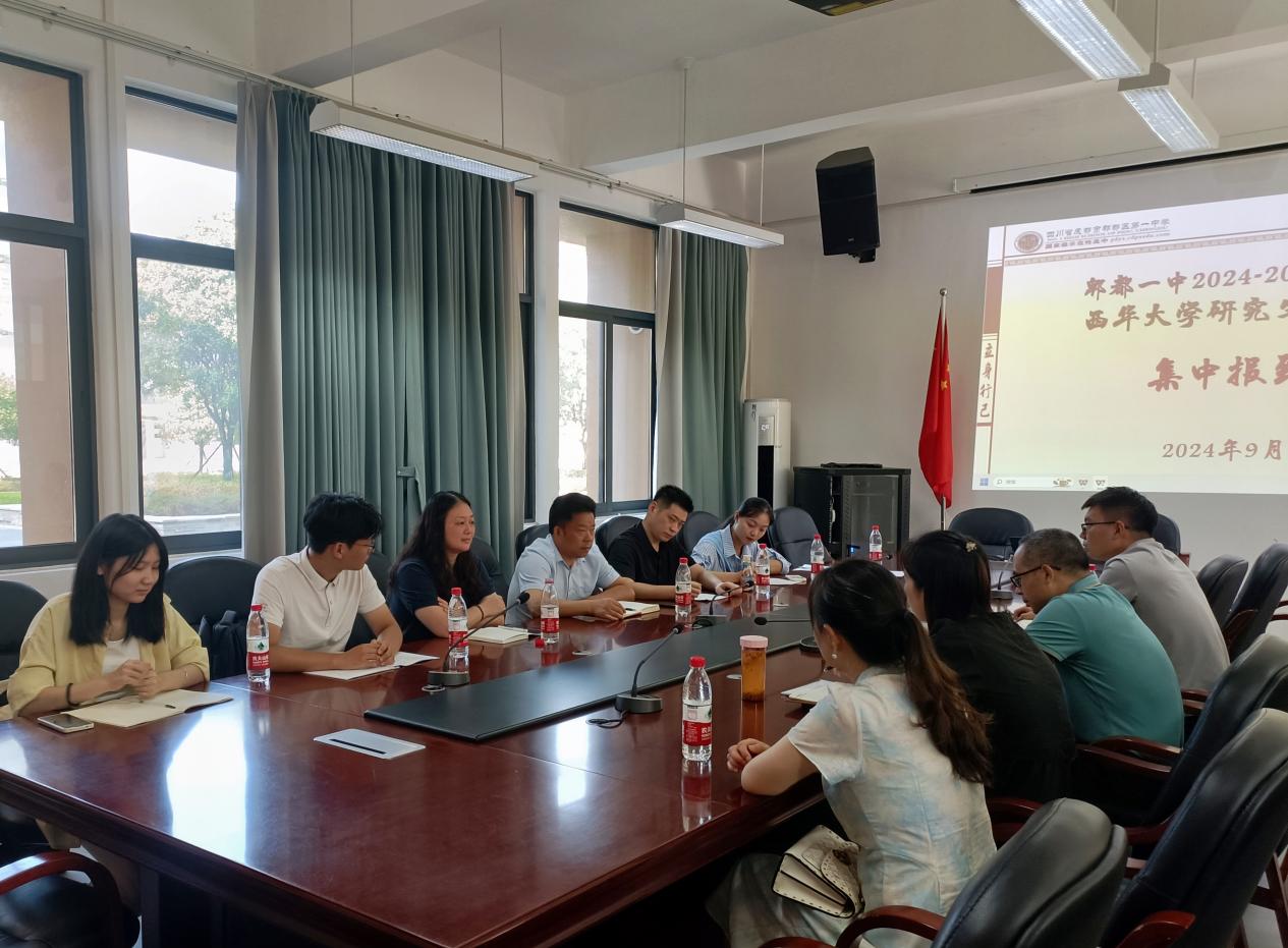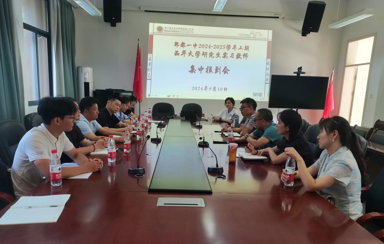 在国家大力推进大中小学思政课一体化建设的宏观背景下,又逢第40个教师节之际,西华大学马克思主义学院2023级学科教学(思政)专业硕士研究生于2024年9月10日前往郫都一中教学实习。郫都一中隆重举行实习报到会。郫都一中校长蒋春鹏、副校长杨祖琴、教务处副主任王攀、西华大学马克思主义学院副院长尹德志、思想政治教育系主任何为、副教授罗钰及学科教学(思政)方向研究生参加了本次会议。