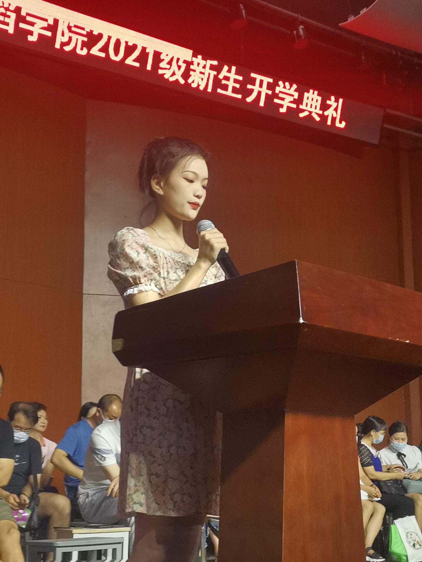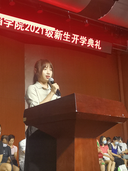 2021级舞蹈表演专业赵子萱同学代表全体新生发言,她首先回顾了艺考的艰辛。她表示,大学不是学习的终点,而是新的起点,她倡导全体新同学尽快适应新环境;团结友爱,互帮互助;尊师好学,持之以恒;遵守校纪校规,培养高尚的思想品德,做品学兼优的新时代大学生。